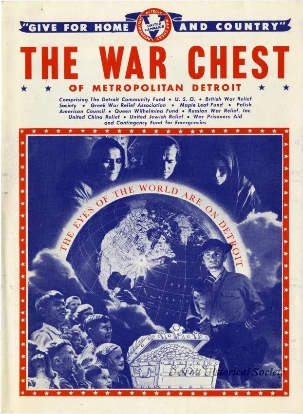 Four panel, parallel folded brochure concerning the War Chest of Metropolitan Detroit, a charitable organization comprising the Detroit Community Fund, the United Service Organizations, the British War Relief Society, the Greek War Relief Association, the Maple Leaf Fund, the Polish American Council, the Queen Wihelmina Fund, Russian War Relief, Incorporated, United China Relief, United Jewish Relief, War Prisoners Aid and Contingency Fund for Emergencies. The cover depicts a soldier standing beside a chest of coins in front of a globe with light emanating from Detroit, as a crowd of children and a trio of women watch. Within each of the groups under the umbrella of the War Chest are described, and readers are urged to help the organization reach its $5,800,000 goal.