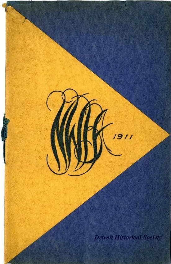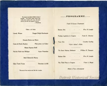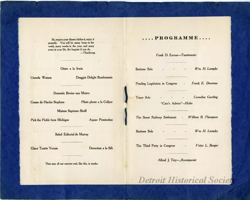 Program for an unknown event, likely a bar association dinner. "NWBA 1911," is printed on a triangular flap on the cover. Within dishes, many with whimsical names are listed, as is a series of lectures--"Pending Legislation in Congress," "The Street Railway Settlement," and "The Third Party in Congress"-- intersected with musical selections. The speakers--Frank D. Eaman, Frank E. Doremus, William Barlum Thompson, and Victor L. Berger--are all from legal backgrounds.