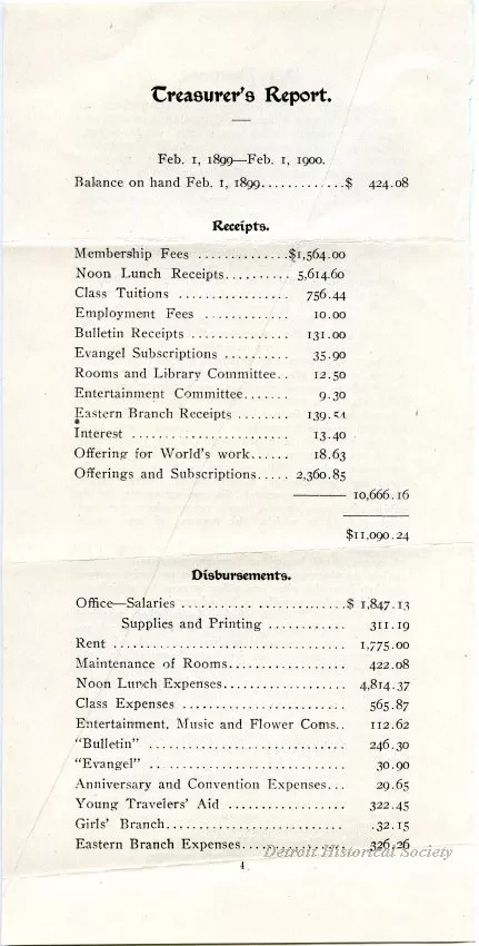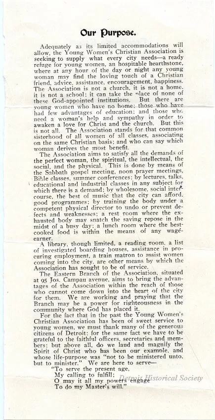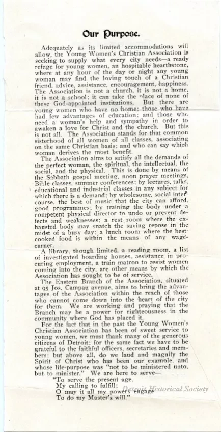 One page torn from a brochure concerning the Young Women's Christian Association. The brochure is printed in black text on white paper. One side of the page is entitled, "Our Purpose," and gives the mission statement for the organization. The other side of the page is entitled, "Treasurer's Report," and shows a summary financial statement from February 1, 1899 to February 1, 1900.