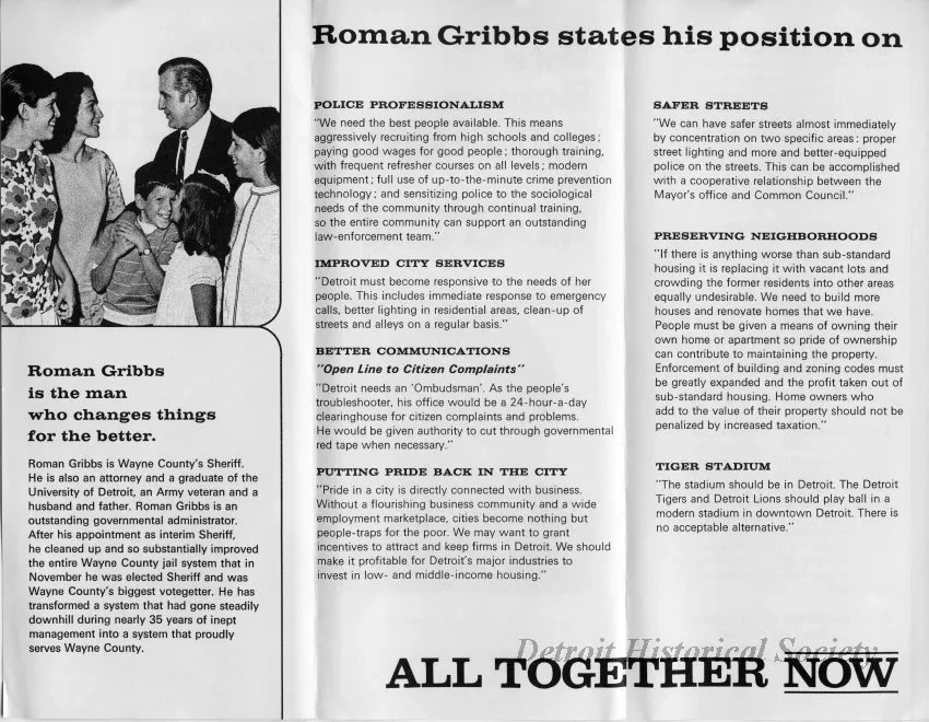 Black and white trifold brochure, produced by Citizens for Roman Gribbs, promoting Gribbs' campaign for Mayor of Detroit by briefly detailing his position on popular political issues. The cover features an portrait of Roman Gibbs while the inside features an image of Roman Gibbs with a woman, a teenager and three children.