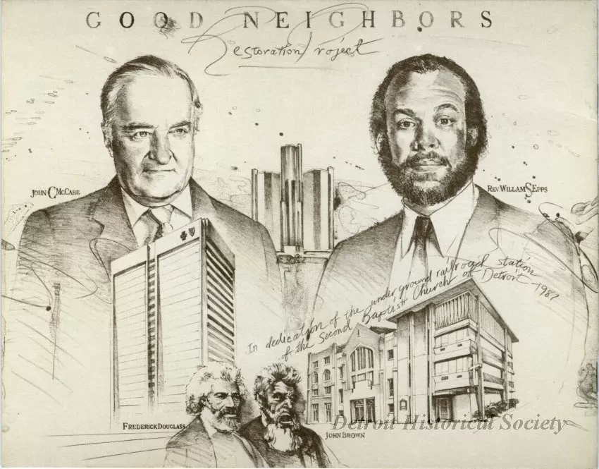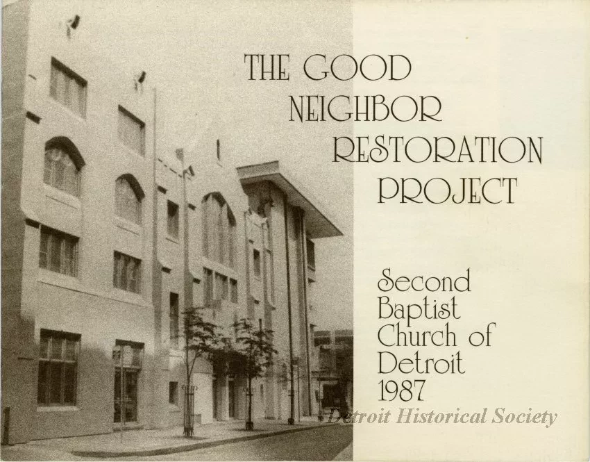 Brochure about the Good Neighbor Restoration Project at Second Baptist Church. Includes black & white photos by Ervin Dawson, maps, and messages from Rev. William Saxe Epps and John C. McCabe (CEO of BCBSM).