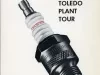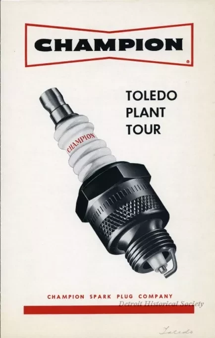Trifold brochure advertising a tour of the Champion Spark Plug Co. Toledo Plant in Toledo, Ohio. Described inside are the stations on the tour and the performance-design features of Champion Spark Plugs.