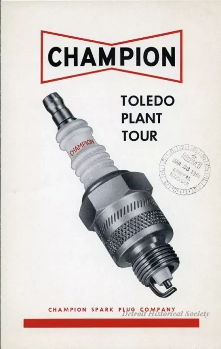 Trifold brochure advertising a tour of the Champion Spark Plug Co. Toledo Plant in Toledo, Ohio. Described inside are the stations on the tour and the performance-design features of Champion Spark Plugs.