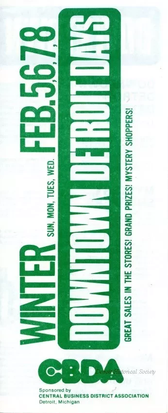 One brochure advertising "Downtown Detroit Days." The bi-fold brochure is printed in green text on white paper and gives details about the downtown shopping event which took place on February 5-8, 1978. The brochure was prepared by the Central Business District Association (CBDA).