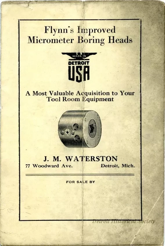 One folded brochure entitled, "Flynn's Improved Micrometer Boring Heads," which shows various machine tool products for sale by J. M. Waterston of Detroit. The brochure is printed in black text on slightly yellowed paper and includes pictures, specifications, and prices of products.