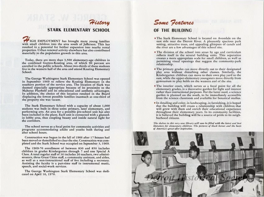 On bi-fold brochure (and 2 copies) about George W. Stark Elementary School. Includes black & white photos and information about the school's namesake and features of the building.