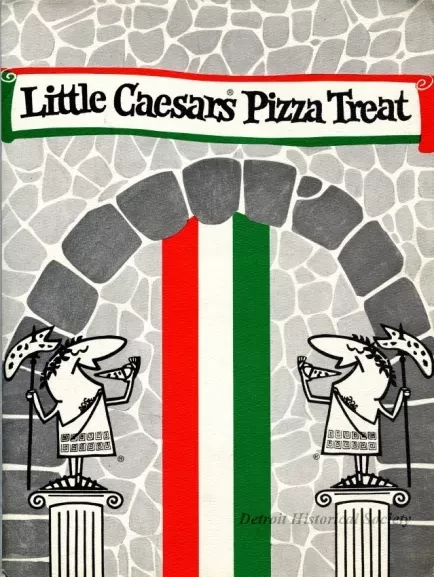 One brochure package entitled "Little Caesars Pizza Treat." The bi-fold, folder-style brochure has black title text on the cover and shows a multi-color drawing of the Little Caesars mascot. The folder interior has a pocket on the right side which contains information about Little Caesars Enterprises, Inc., and invites the reader to consider investing in the "Little Caesars Franchise Program." The various items in the brochure package are summarized as follows: