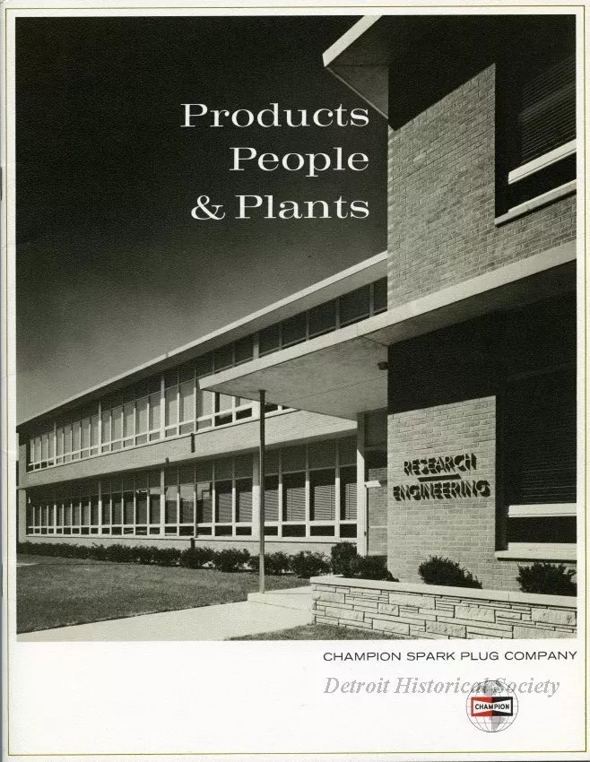 24-page black and white illustrated brochure for the Champion Spark Plug Co. It includes sections on advertising, sales, sales promotion, marketing research, public relations, racing, manufacturing, manufacturing facilities, automotive technical services, people, and products.