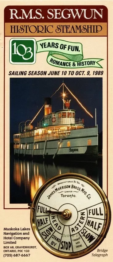 One multi-fold brochure entitled "R.M.S. Segwun, Historic Steamship" that was published by the Muskoka Lakes Navigation and Hotel Company, Ltd., of Gravenhurst, Ontario. The multi-color brochure was printed on light tan paper and includes information about the passenger excursion steamship, "R.M.S. Segwun." Vessel details, cruise schedules, fares, a location map, and color photographic images are also shown. The business card of the General Manager, Russ Brown, is included with the brochure.