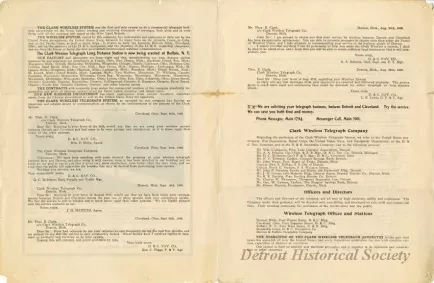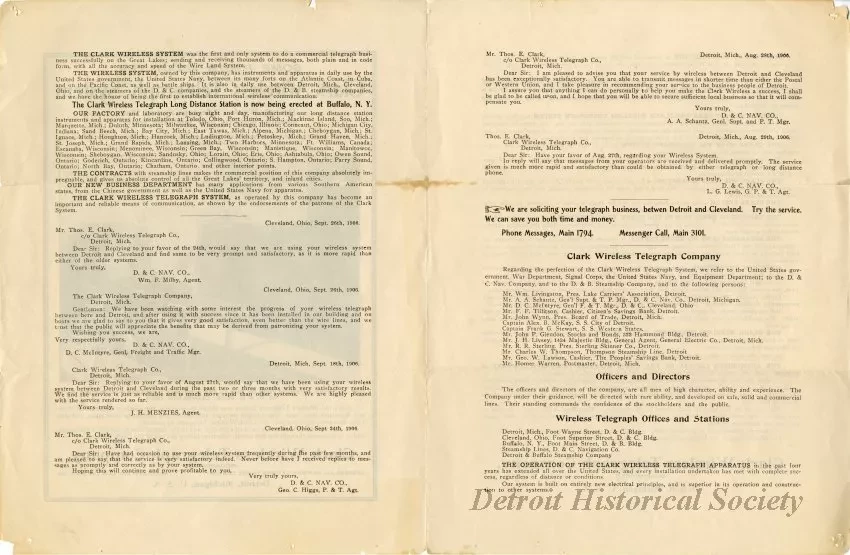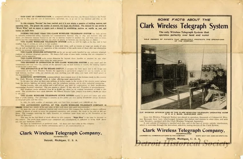 Large brochure advertising the Clark Wireless Telegraph System with an emphasis on the system's usage by the Detroit and Cleveland Navigation Company. A photo on the cover shows the Clark Wireless Telegraph operating room within the Detroit and Cleveland Navigation Company building in Cleveland. Within usage of the system on the Great Lakes as well as around the Pacific and Atlantic by the U.S. Navy is discussed. Several testimonial letters from managers and agents of the Detroit and Cleveland line are also printed inside. The back page again extols the benefits of the system, and is geared toward investors in the company's stock.