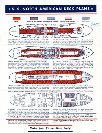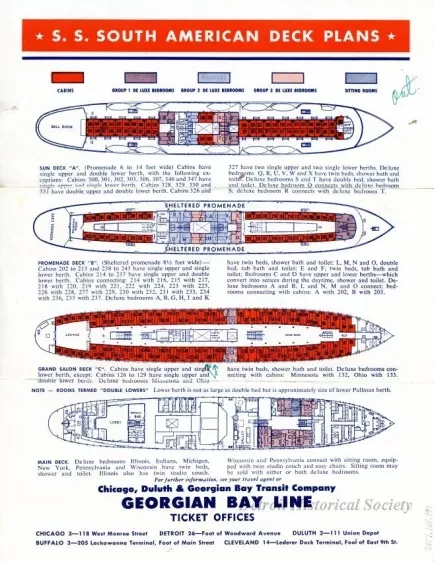 One brochure showing deck plans for the passenger steamships, SS North American and SS South American, of the Chicago, Duluth & Georgian Bay Transit Company (Georgian Bay Line). The plans are printed in red and blue ink on white paper and give the deck layouts with cabin numbers for each ship.