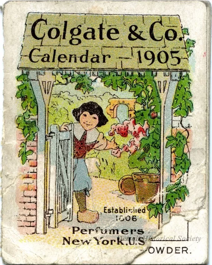 Pocket-sized calendar entitled, "Colgate & Co. Calendar - 1905," softcover. The cover has a multi-color picture of a child beneath a garden arbor. Inside pages have months printed in black text on white paper and are surrounded by colorful flower garden scenes.