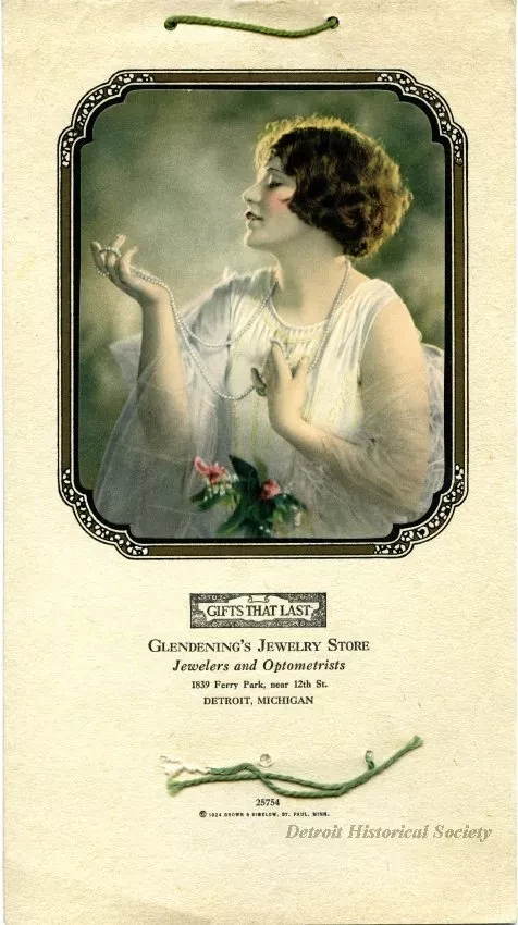 Calendar cover advertising "Gifts That Last - Glendening's Jewelry Store, Jewelers and Optometrists." The cover is light tan and is printed in black text. A picture is glued to the cover which shows a young woman in a white chiffon dress who is holding a string of pearls. The interior pages were bound in place with green string, but all have been cut out.