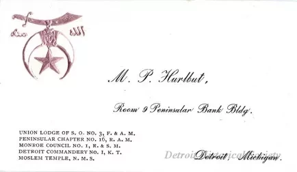 This business card is printed in black ink on white paper and also includes an embossed silver-colored Masonic emblem in the upper left corner of the card. The card was included in an envelope along with a 3-page letter that was written by Myrtle P. Hurlbut who was the Secretary and General Manager of the Office of the Commissioners of Parks and Boulevards.