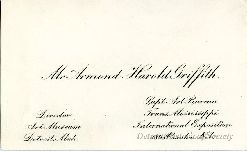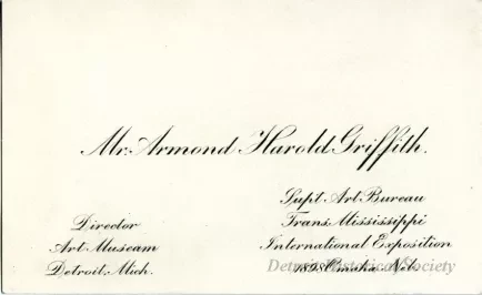 Business card of Mr. Armond Harold Griffith, "Director, Art Museum, Detroit, Mich." and "Supt. Art Bureau, Trans Mississippi International Exposition, 1898, Omaha, Neb." The card was printed in black ink on heavy white paper.