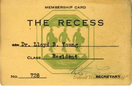 Membership card for The Recess, issued to Dr. Lloyd B. Young. His class is listed as "resident," the card is numbered 728, and it has been endorsed by the club secretary R.E. Lawler. A green symbol consisting of three men walking beneath a bird and above a fish is printed in the background of the card,