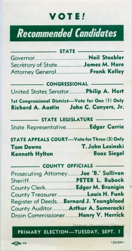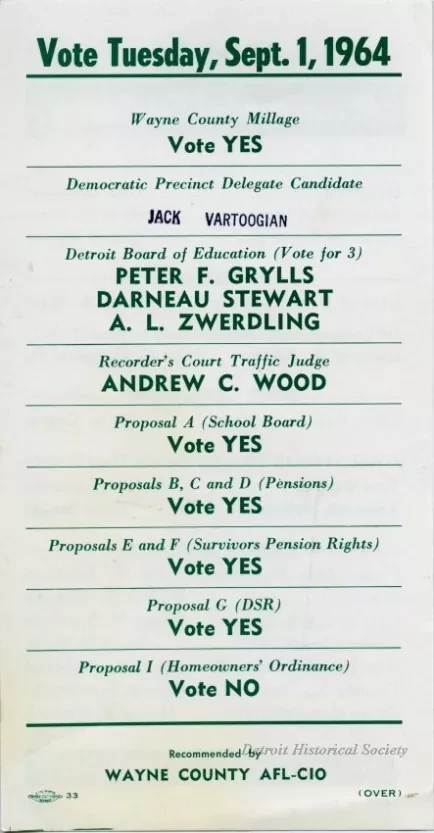 Political slate card circulated by the Wayne County AFL-CIO ahead of the September 1, 1964 election. The recommended candidates and ballot proposal positions are: