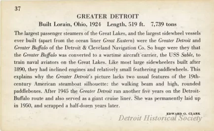 The largest passenger steamers of the Great Lakes, and the largest sidewheel vessels ever built (apart from the ocean liner GREAT EASTERN) were the GREATER DETROIT and GREATER BUFFALO of the Detroit & Cleveland Navigation Co. So huge were they that the GREATER BUFFALO was converted to a wartime aircraft carrier, the USS SABLE, to train naval aviators on the GREAT LAKES. Like most large sidewheelers built after 1890, they had inclined engines and relatively small feathering paddlewheels. This explains why the GREATER DETROIT's picture two usual features of the 19th century steamboat silhouette: the walking beam and high, rounded paddleboxes. After 1945 the GREATER DETROIT ran another five years on the Detroit-Buffalo route and also served as a giant cruise liner. She was permanently laid up in 1950, and scrapped a half-dozen years later. -Edward O. Clark