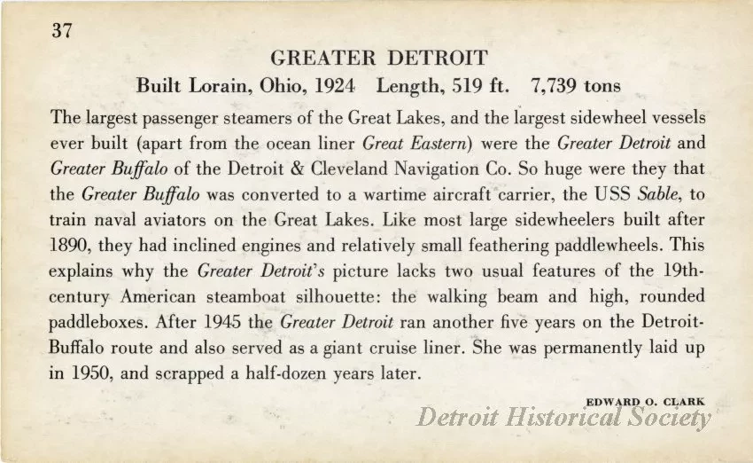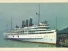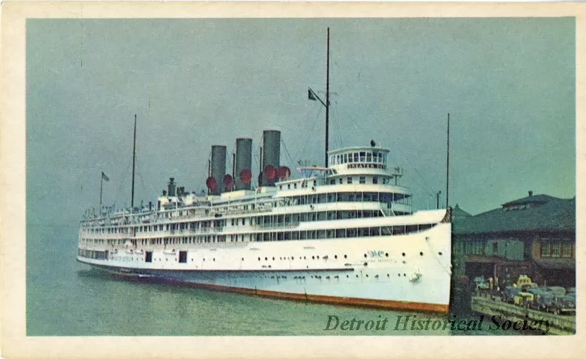 Card bearing a colorized image of the GREATER DETROIT--depicted as painted white--docked on the recto and information about the vessel on the verso: