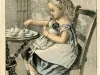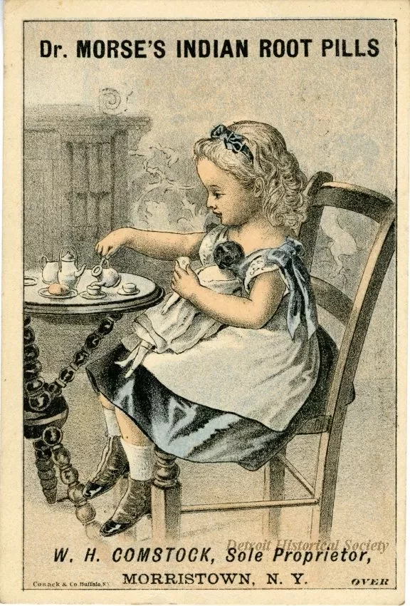 Trade Card advertising Dr. Morse's Indian Root Pills, sold by W.H. Comstock of Morristown, New York. The verso depicts an illustration of a girl seated at a small table pouring tea into a small cup, while holding a doll in her lap. The verso contains a passage about the product, as well as a field below the words, "For Sale By," where "Belle," has been handwritten in pencil, and "Mrs. L Glover, Orangeville Mills, Barry Co." has been stamped.