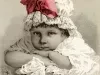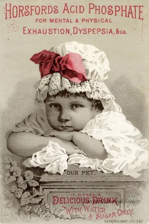 Trade card advertising Horsfords Acid Phosphate, manufactured by Rumford Chemical Works of Providence, Rhode Island. The verso depicts a small child in a white bonnet with a red ribbon resting his or her head on a table. "Our pet," is written below the child. The verso bears the silhouetted profile of Count Rumford, along with a passage about the benefits of the drink.