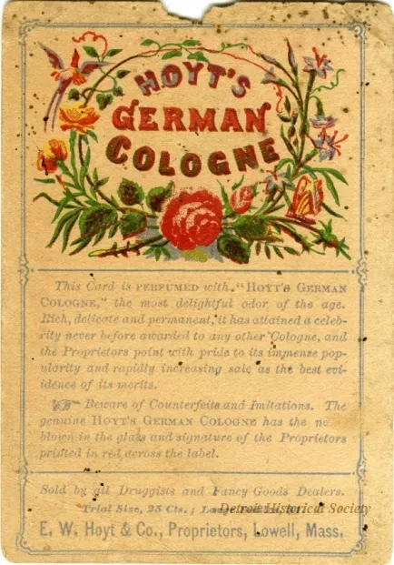 Trade card advertising Hoyt's German Cologne, manufactured by E.W. Hoyt and Company of Lowell Massachusetts. The card is printed in color with a floral design encircling the header. Below is a passage about the cologne, which notes that the card is perfumed with the scent.