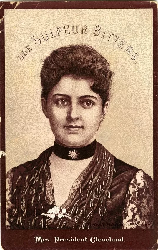 Trade card advertising Sulphur Bitters with a lithograph of Frances Folsom Cleveland clad in a dress and choker. The verso advertises two medical books--"Disease, Its Causes, and Home Cure," by Dr. Kaufmann, and another about Alexis St. Martin and William Beaumont, from A.P. Ordway and Company of Boston.