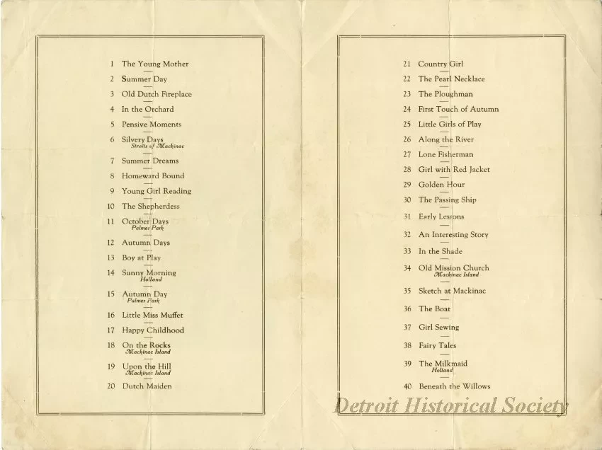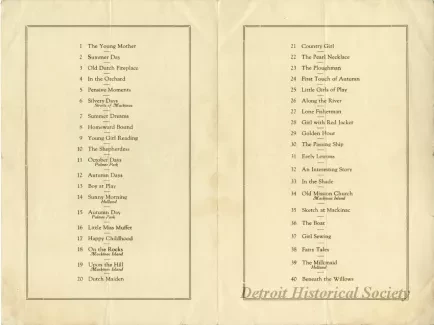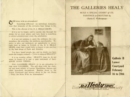 Half-folded exhibit catalog from an exhibit of Charles E. Waltensperger's oil paintings and sketches held at the D.J. Healy Shops at 222-228 Woodward Avenue, from February 16th to the 28th. A half-tone image of the painting, "Young Girl Reading," is on the cover, and 40 paintings are listed within. A short passage discussing the quality of products carried by Healy is printed on the back of the catalog.