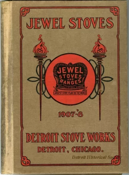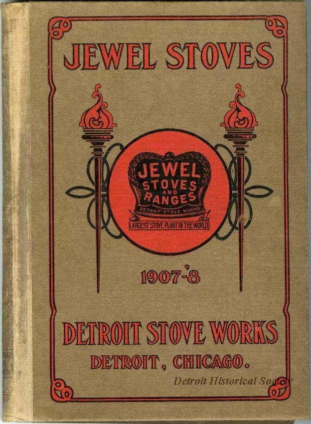 Catalog from the Detroit Stove Works bound in a brown hard cover. The cover reads "Jewel Stoves; 1907-8; Detroit Stove Works; Detroit, Chicago." Contained within it are prices, images, measurements and advertising information for Jewel Stoves and Ranges, as well as accessories for them, from 1907 through 1908. Included in the back of the catalog is a telegraphic code word list. On the back cover is a Jewel Stoves, Ranges and Furnaces logo.