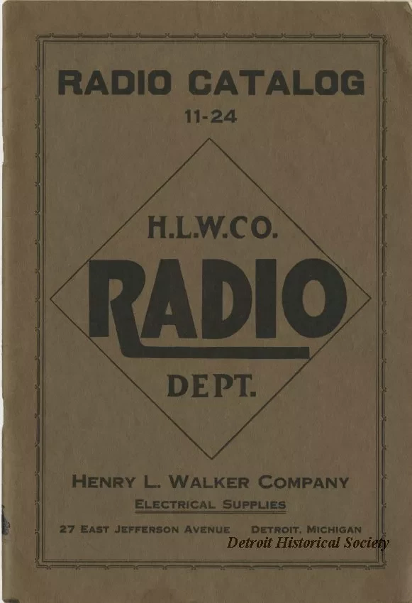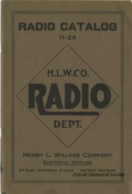 Catalog of radios and radio parts available through the Henry L. Walker Company of 27 East Jefferson Avenue. Within is a photo of the store's window display, as well as photos and illustrations of radios, speakers, vacuum tubes, batteries, switches, chargers, jacks, plugs, sockets, adapters, rheostats, potentiometers, condensers, switches, resistors, wires, meters, transformers, tuners, dials, antennae, crystals, cabinets, and books. The catalog is bound in a brown paper cover, and was printed by William Cornehl and Sons.