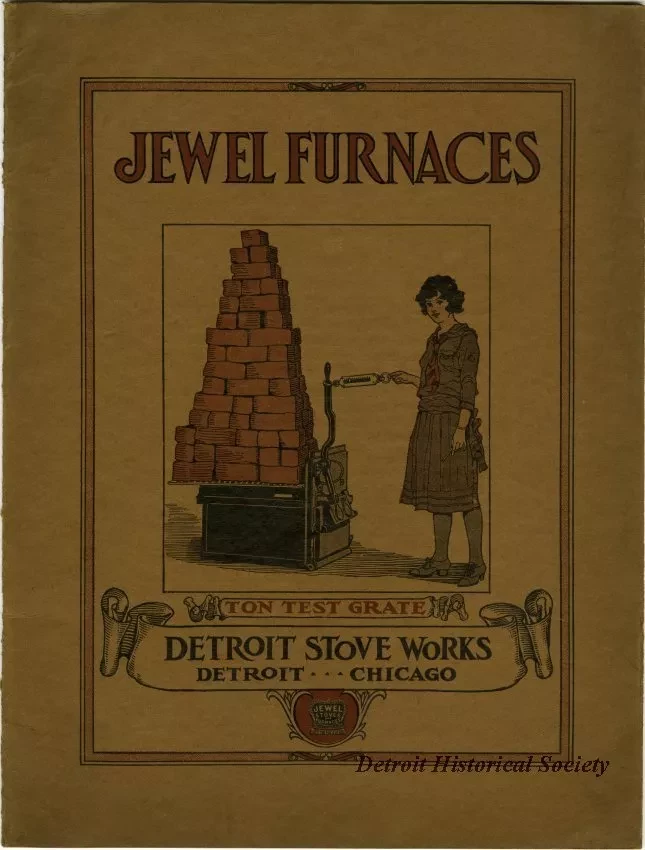 Catalog from the Detroit Stove Works advertising Jewel Air Furnaces. An image on the front cover shows a young woman holding on to a fob that is attached to the lever of a furnace with bricks piled on top of it. Text on the front cover reads '"Jewel Furnaces; Ton Test Grate; Detroit Stove Works; Detroit - Chicago." Contained within it is prices, images, measurements and advertising information for Jewel Coal Saver Warm Air Furnaces, as well as accessories for them. Included in the back of the catalog is a telegraphic code word list.