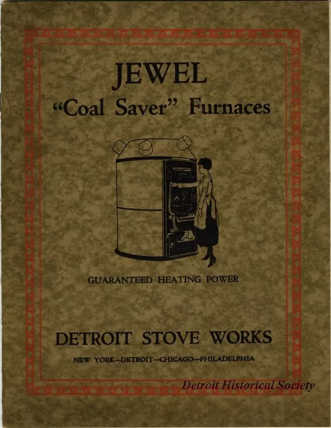Catalog from the Detroit Stove Works advertising Jewel Air Furnaces. Text on the front cover reads '"Jewel Coal Saver Furnaces; Guaranteed Heating Power; Detroit Stove Works; New York - Detroit - Chicago - Philadelphia." Contained within it is prices, images, measurements and advertising information for Jewel Coal Saver Warm Air Furnaces, as well as accessories for them, from 1925. Included in the back of the catalog is a telegraphic code word list.