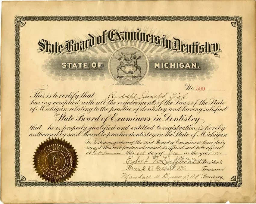 Certificate declaring that Ruldolph Joseph Lieb is authorized to practice dentistry in Michigan by the State Board of Examiners in Dentistry. The document was granted in Port Huron on December 6, 1901, and is signed by Egbert T. Loeffler, D.D.S., president; Frank O. Gilbert, D.D.S., treasurer; and Marshall B. Dennis, D.D.S, secretary. The golden seal of the State Board of Examiners in Dentistry has been affixed at the lower left. The certificate bears the mark of the Calvert Lithograph Company of Detroit.