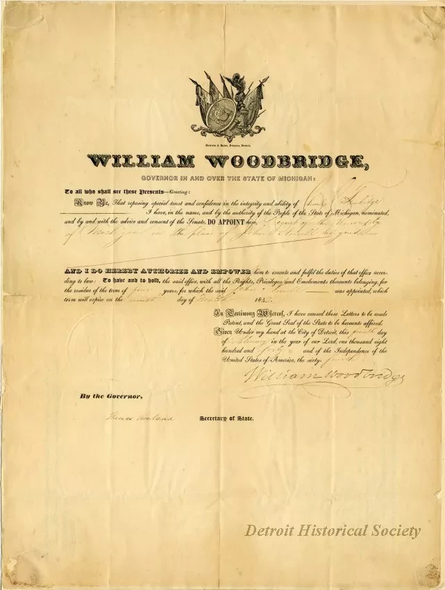 Certificate, printed on paper and mounted on a paper backing, appointing Charles C. Trowbridge to the position of Regent of the University of Michigan, issued February 4th, 1840. The certificate is signed by William Woodbridge, Governor, and Thomas Rowland, Secretary of State, of Michigan. The text of the certificate is as follows: