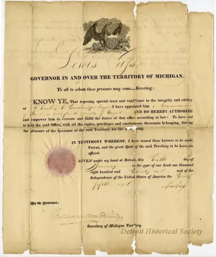 Certificate appointing Charles Trowbridge to the position of Commissioner of Bail in and for the County of Wayne, signed by Lewis Cass, Governor, and William Woodbridge, Secretary, in 1821. The document is stamped with the great seal of the Michigan Territory.
