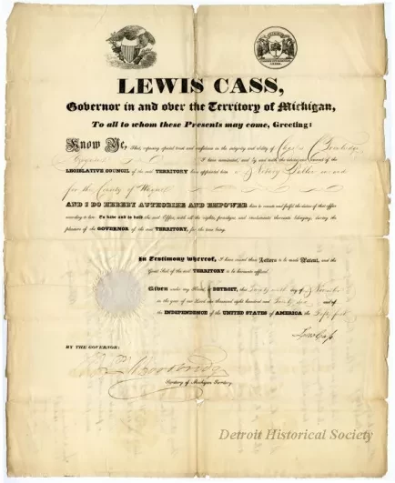 Know Ye, That, reposing special trust and confidence in the integrity and ability of Charles Trowbridge Esquire I have nominated, and by and with the advice and consent of the Legislative Council of the said Territory have appointed him a Notary Public in and of the County of Wayne