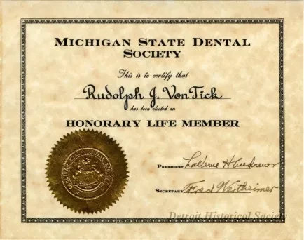 Certificate issued to Rudolph J. Von Tick by the Michigan State Dental Society declaring that he has been elected an honorary life member. The certificate is signed by the organization's president LaVerne H. Andrews, and the secretary Fred Westheimer. The gold seal of the Michigan State Dental Society has been affixed.