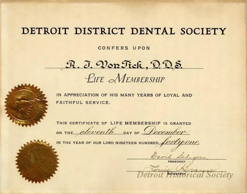 Certificate issued to Rudolph J. Von Tick by the Detroit District Dental Society on December 11, 1941, conferring lifetime membership upon him. The certificate is signed by the organization's president David Seligson, and the secretary Louis Braun. Two worn gold seal are affixed.