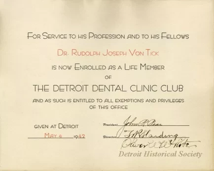 Certificate issued to Rudolph J. Von Tick by the Detroit Dental Clinic Club on May 4, 1942 declaring that he has been made an honorary life member. The certificate is signed by the organization's president John R. Bear, and the directors F.R. Harding, and Oliver W. White.
