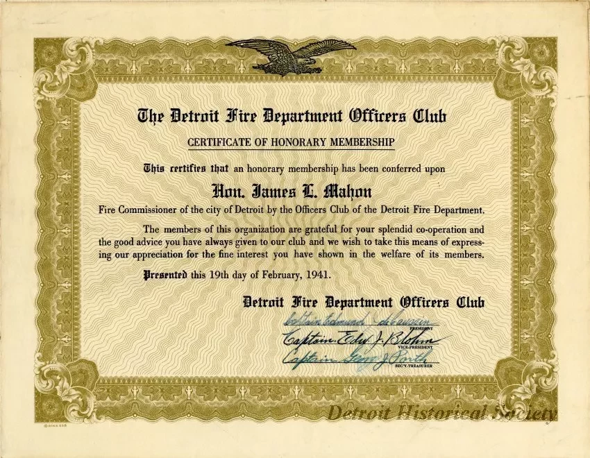 Detroit Fire Department Officers Club Certificate of Honorary Membership granted to the Fire Commissioner James L. Mahon, dated February 19, 1941. The certificate is signed by the group's president, Captain Edmund J. de Laussin[?]; its vice-president Captain Edward J. Blohm; and its secretary-treasurer, Captain George J. Parth. The certificate is mounted on linen.