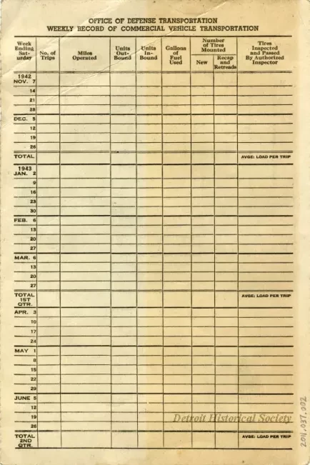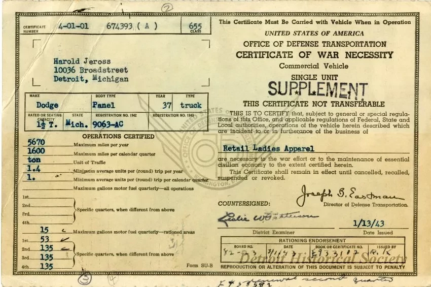 Certificate of War Necessity Supplement certificate number 674393 (A) issued to Harold Jeross, 10036 Broad Street, Detroit, Michigan by the Office of Defense Transportation on January 13, 1943. The certificate is printed in black text on yellowed paper. Some blank lines have been completed in pen handwriting and most are typewritten. The verso has lines and columns for maintaining a "Weekly Record of Commercial Vehicle Transportation."