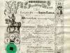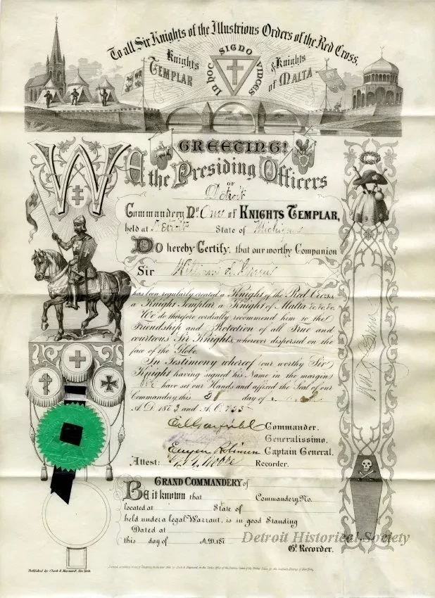 Large membership certificate presented by the Knights Templar to William S. Green on March 31, 1873. The document is signed by Commander Eil Garfield, Captain General Euyen Robinson, recorder G.B. Noble, and a Generalissimo whose name has faded. The certificate includes lithographs of knights, a temple, ceremonial robes and swords, and a coffin, as well as a green Knights Templar seal attached by a black ribbon.