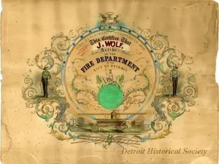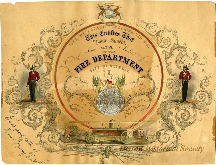 Detroit Fire Department active duty certificate, engraved by Capewell and Kimmel, and issued to Louis Specht on May 14, 1857. The document bears the signatures of President Jerome Croul, Treasurer Alexander Paton, and Secretary Benjamin Vernor, beside a silver embossed Fire Department of the City of Detroit seal. Hand-colored illustrations of uniformed firefighters, an early fire apparatus and firefighting equipment, the seal of the State of Michigan, and Neptune flanked by two winged monsters are bordered by scrollwork. The number "12" has been added to the helmets of the firefighters and to the apparatus, likely indicating Specht's involvement in Woodbridge Fire Company No. 12. "Great grand father of Daneil Murray Embach," has been handwritten in the lower left corner.