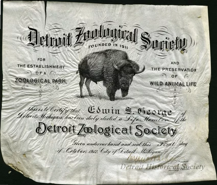 Detroit Zoological Society certificate signifying the life membership of Edwin S. George in the organization, dated October 1, 1912. The certificate is signed by the society's president, Bryant Walker, and secretary of director, Richard E. Follett. The document is printed on parchment and features an engraving of a bison, as well as the header, "Detroit Zoological Society, Founded in 1911 for Establishment of a Zoological Park and the Preservation of Wild Animal Life."