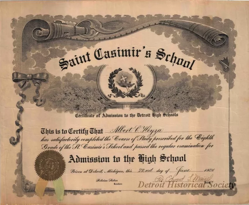 One "Certificate of Admission to the Detroit High Schools." It is printed in "Old English" and cursive style text on white paper and also includes a decorative engraved design at the top and along the border. The certificate was issued by Saint Casimir's School and certified that "Albert C. Heyza has satisfactorily completed the Course of Study prescribed for the Eighth Grade of the St. Casimir's School and passed the regular examination for Admission to the High School." The certificate was signed by "Rev. Edward S. Maisel" and was dated June 22, 1924. A gold-colored embossed seal with a yellow/green ribbon is located in the lower left corner of the certificate. Small printed text near the lower border notes "Felician Sisters, Teachers," and also shows "20A: W. M. Welch, Diploma House, Chicago."
