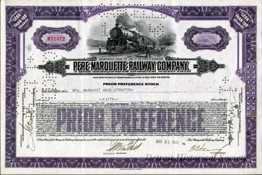 Pere Marquette Railway Company "less than 100 shares" stock certificate, number B01072, for 50 shares issued to Mrs. Margaret Head Stockton on May 29, 1944. The certificate features an engraving of locomotive 1357 pulling a train. The certificate is signed by the company's assistant secretary and vice president, as well as the assistant secretaries of the Merchants National Bank of Boston and the Old Colony Trust Company. The form on the verso indicates that the certificate was surrendered for exchange, and it has been punched with cancellation marks dated January 12, 1948.