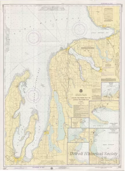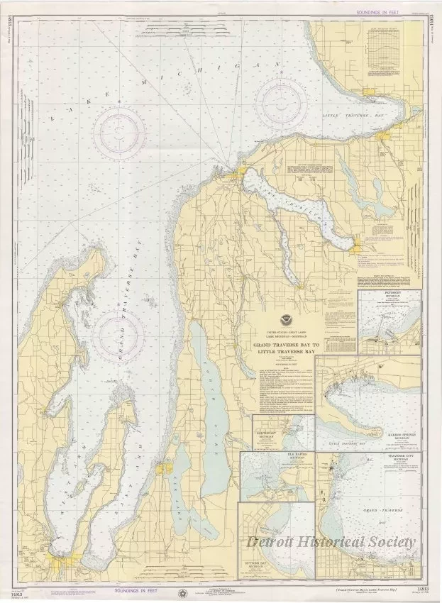 One navigational chart entitled, "Grand Traverse Bay to Little Traverse Bay," that was published by the National Oceanic and Atmospheric Administration (NOAA), Lake Survey Center The chart (No. 14913) is a polyconic projection and is drawn at a scale of 1:80,000. It shows the Lake Michigan shoreline from Harbor Springs southward to Traverse City including Round Lake, Lake Charlevoix, Walloon Lake, Torch Lake, and Elk Lake. Enlarged inset charts of Petoskey, Harbor Springs, Northport, Traverse City, Elk Rapids, and Suttons Bay are shown along the lower right side of the sheet. Lake areas are shown in white and light blue depending upon water depths which are shown in feet. Distances are given in statute miles. Lines of latitude and longitude are shown in black. Course bearings are shown along with navigational range markers. Lighthouses and buoys are also noted. Printed text in the lower left corner shows "12th edition, Aug. 9, 75." The verso shows a map of the Great Lakes region in light gray along with chart numbers and areas of coverage.