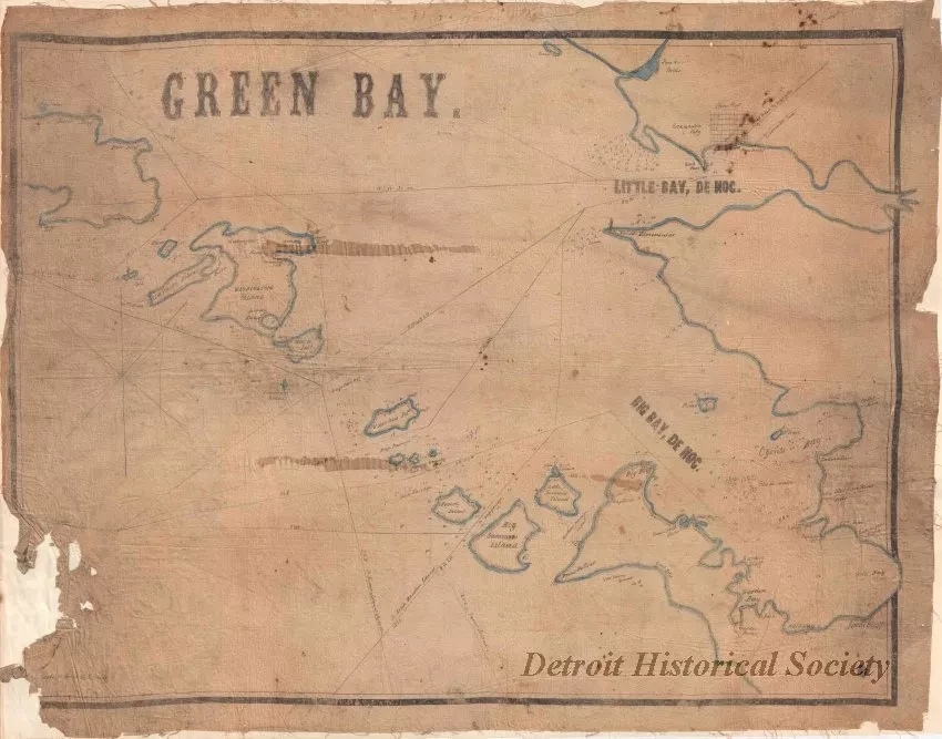 One navigational chart entitled, "Green Bay," that was probably compiled and drawn by a ship captain. The chart is hand-drawn in black ink on linen and shows the various islands at the north end of Green Bay, Wisconsin, as well as Little Bay de Noc, the City of Escanaba, and Big Bay de Noc on the south shore of the Upper Peninsula of Michigan. Shorelines are colored with a wide line of light blue ink. A compass rose is shown at the left side of the chart and shows that north is oriented toward the right side of the sheet. The chart shows island names, water depths, ship passage lines and course bearings. Areas of deep water and shoal water are also noted. Several lighthouses are shown on the islands and mainland including Pilot Island, Rock Island, Sand Point, and Peninsular Point. A note in the lower left corner shows "Scale 1/2 inch to a Mile." Faint handwriting at the top center edge of the sheet appears to show "Schr. Wayandotte [Schooner Wyandotte]."