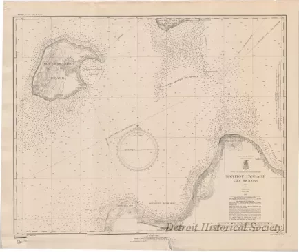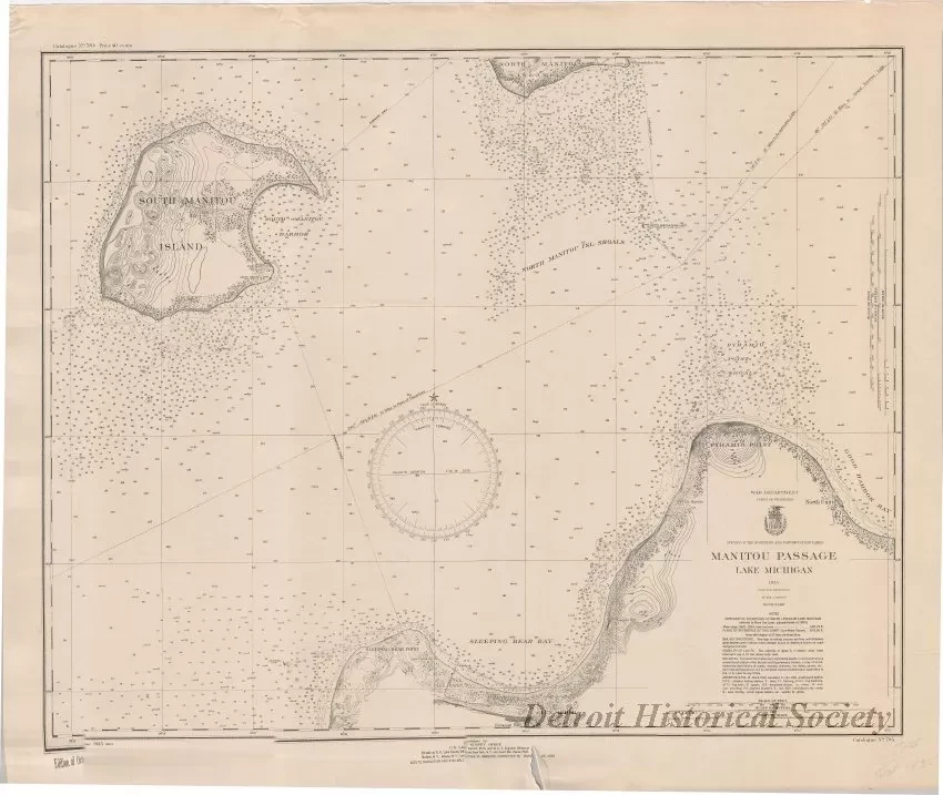 One navigational chart entitled, "Manitou Passage, Lake Michigan." The chart was compiled and published as part of the Survey of the Northern and Northwestern Lakes (War Department, Corps of Engineers). The chart (No. 784) is a polyconic projection and is drawn at a scale of 1:30,000 with text and details printed in black ink on white paper. It covers about 20 miles of the Manitou Passage just north of Glen Arbor, Michigan, and includes information such as soundings in feet, lake bottom characteristics, shoreline details, lighthouses, lines of latitude and longitude, and sailing directions. Printed text in the lower left corner shows "Edition of October, 1935."