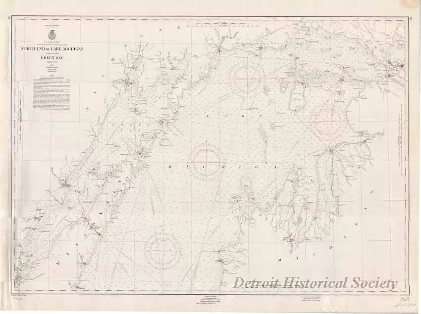 One navigational chart entitled, "North End of Lake Michigan, Including Green Bay," that was compiled and published as part of the Survey of the Northern and Northwestern Lakes (War Department, Corps of Engineers). The chart (No. 70) is a polyconic projection and is drawn at a scale of 1:240,000. It shows the northern portion of Lake Michigan (north of the City of Green Bay, Wisconsin, and north of Arcadia, Michigan). Chart text and details are mostly printed in black ink on white paper except for lighthouses, buoys, and underwater cable crossings which are shown in red. Water depths are shown in feet. Distances are given in statute miles. Other details include lines of latitude and longitude, course bearings, and distances. Printed text in the lower left corner shows "Edition of March, 1957."